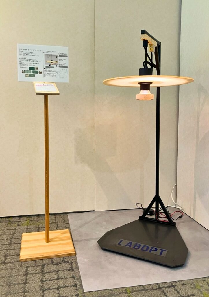 当社は、豊田市のスギ・ヒノキの大径木の利活用促進を狙って、薄板に加工した単板の照明器具への適用を考えました。大径木は近年の和室の減少に伴って需要が低下しており、適切に活用されずに森に残置され、森の高齢化の要因の一つとなっています。当社は単板へ光を当てたときの木目の美しさに着目し、見る人の心を温かくする光の当て方を研究しました。