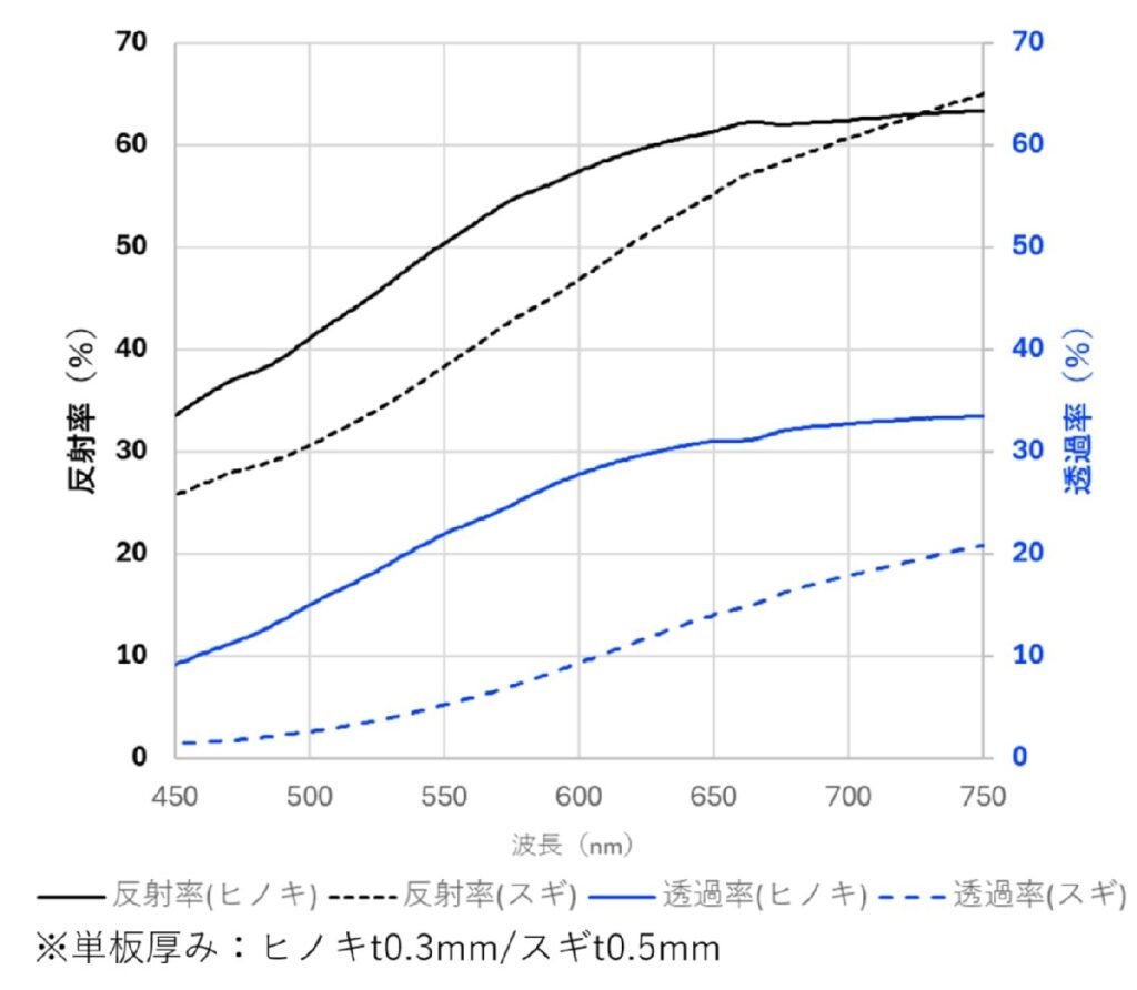 図2 スギとヒノキの単板の分光透過率と分光反射率